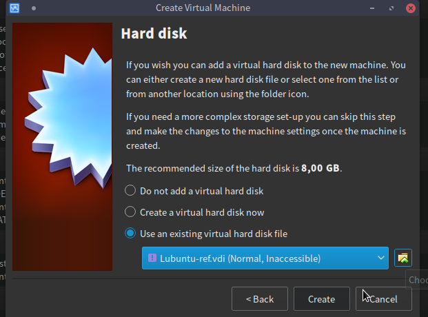 Vyberte poslednú možnosť, kliknite na zložku a nájdite extrahovaný virtuálny disk. A kliknite na Create.